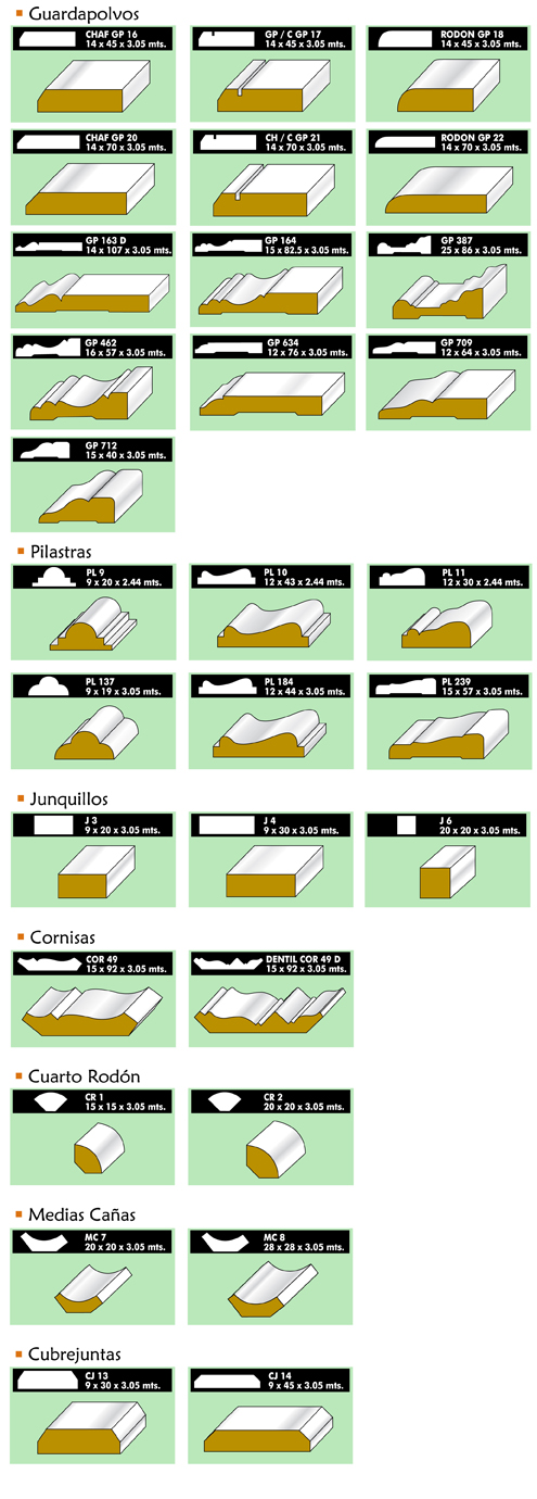 Moldura de MDF Prepintado, sin porosidades, con superficie apta para recibir cualquier tipo de terminación. Gran variedad de diseños y presentaciones.